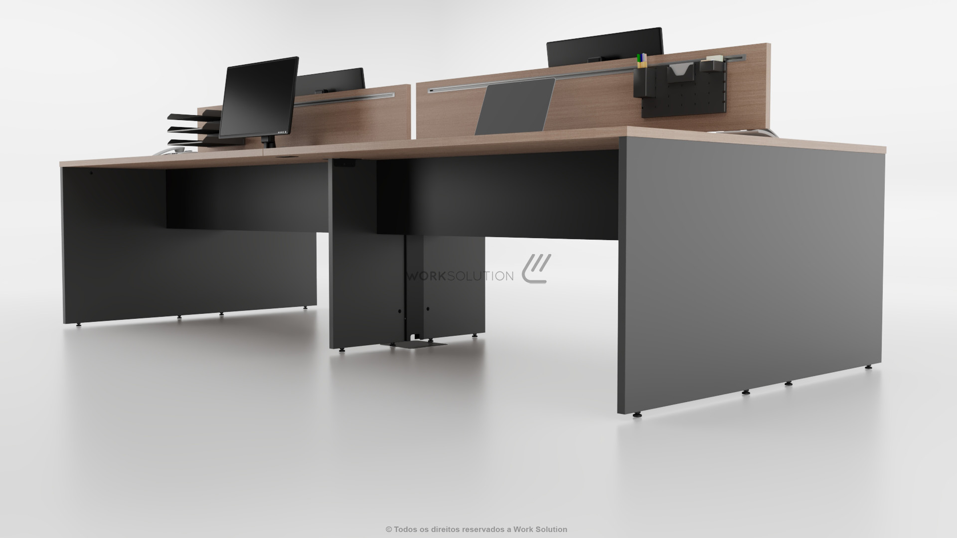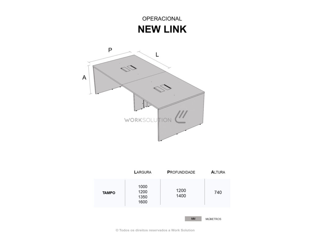 A plataforma de trabalho para escritório, linha NEW LINK, é um produto que agrega todos os benefícios de ergonomia e funcionalidade. Além de otimizar o espaço, ela foi desenvolvida para aliar todas as características que o mercado busca em um só produto, permite diversas combinações de cores, seus pés criam isolamento visual na parte inferior e está 100% em conformidade com as normas técnicas.