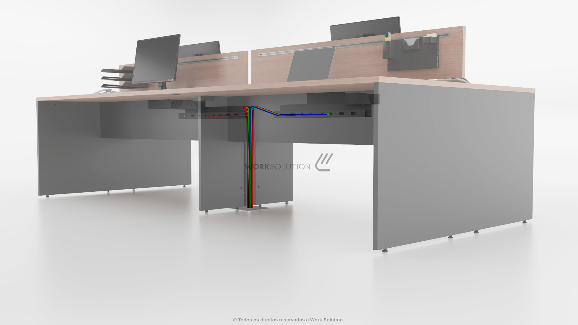 Simule o funcionamento scrollando o botão do mouse. Nesse caso, o acesso do cabeamento até a caixa de conectividade é via shaft central. Dependendo do modelo da mesa, o acesso do cabeamento pode ser via vértebra