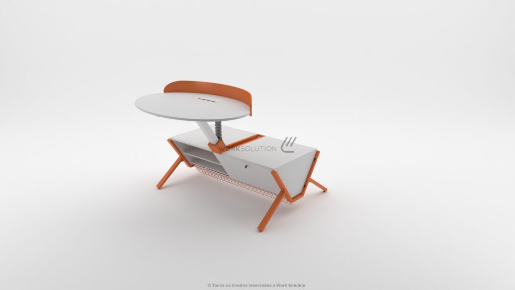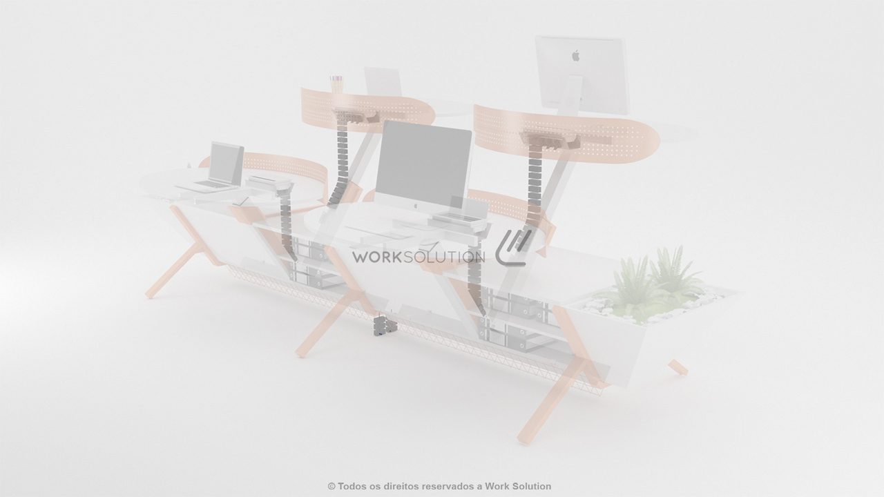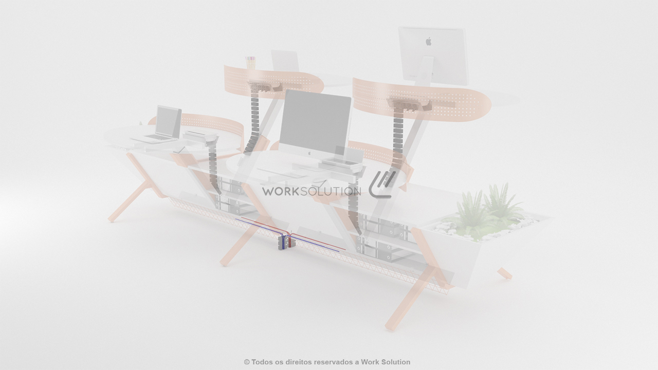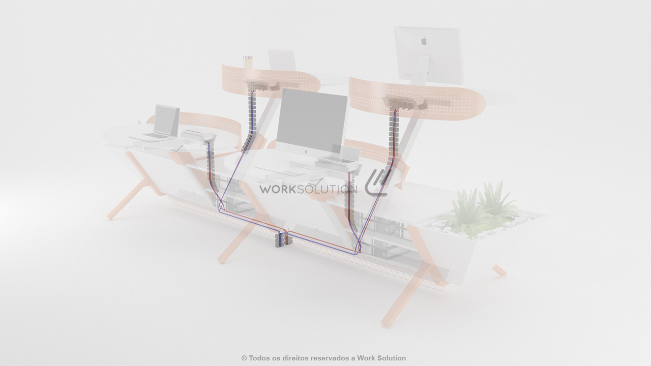 Simule o funcionamento scrollando o botão do mouse. Nesse caso, o acesso do cabeamento até a caixa de conectividade é via vertebra. IMPORTANTE: Para as versões com ajuste de altura, eleve todos os tampos ao nível máximo para dimensionar o tamanho dos cabos (elétrica e dados). Recomendamos deixar uma pequena folga de fio.