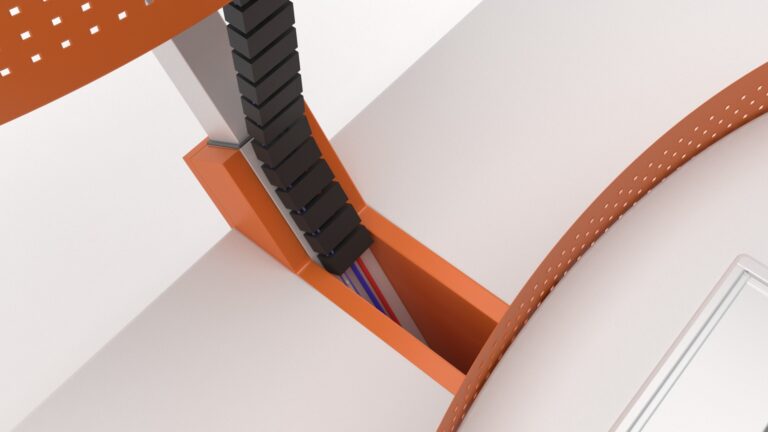 A esteira da mesa esconde e organiza os fios durante a alternância de altura, proporcionando um design arrojado que acompanha o mecanismo da mesa.