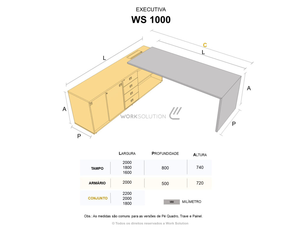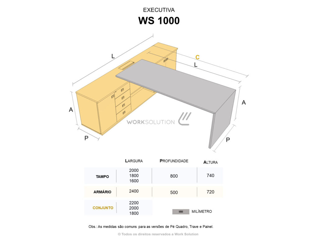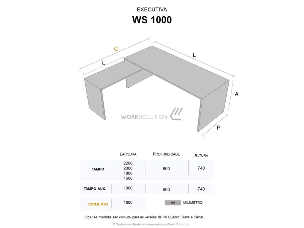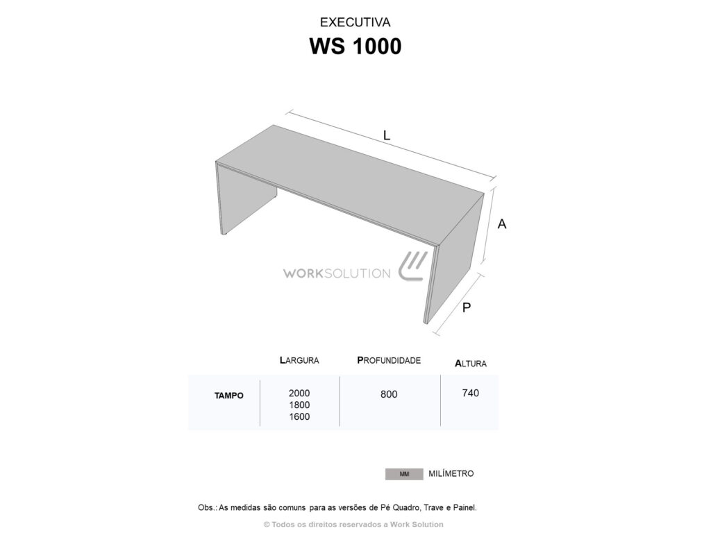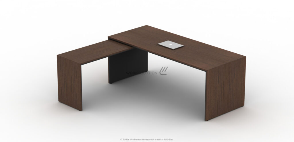 Além da robustez e do design moderno que já são marcas registradas da mesa executiva, linha WS 1000, ela tem duas versões: Tampo único de 25mm e tampo duplo de 36mm, sendo o inferior de 18mm em MDF com cantos arredondados.