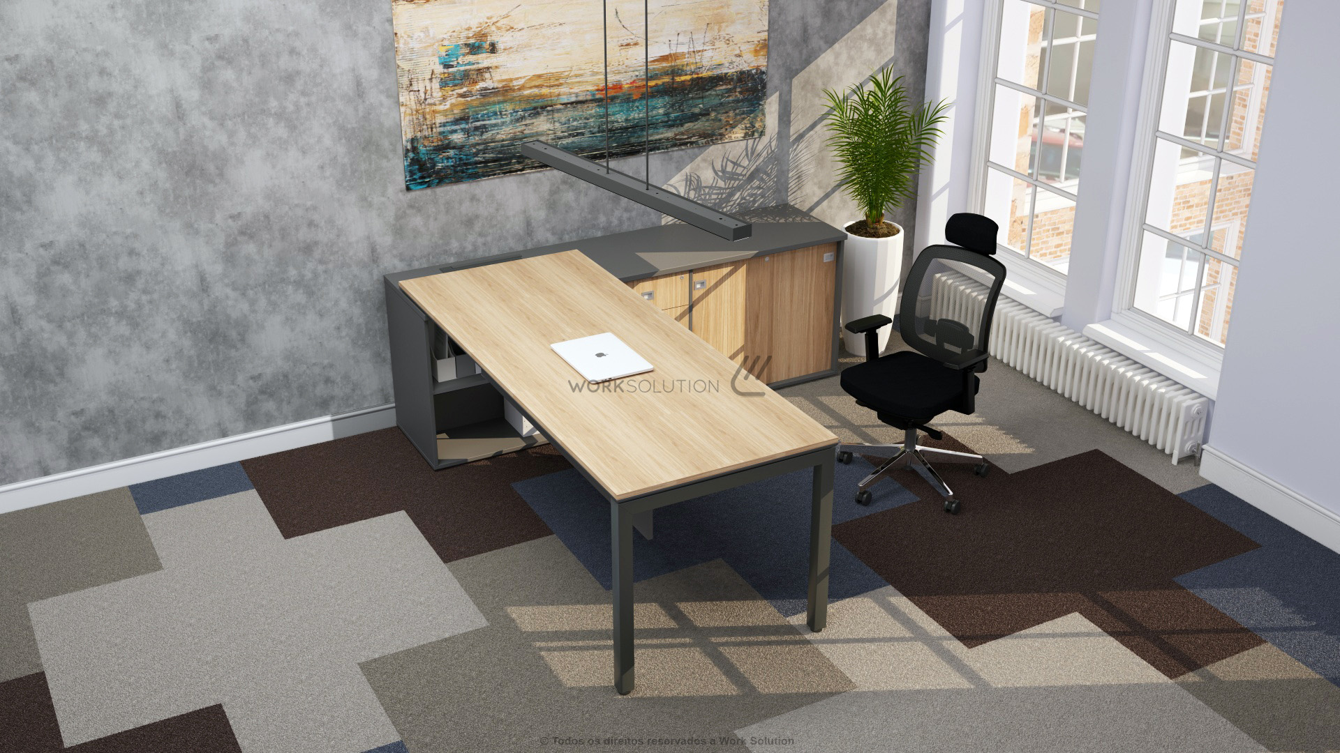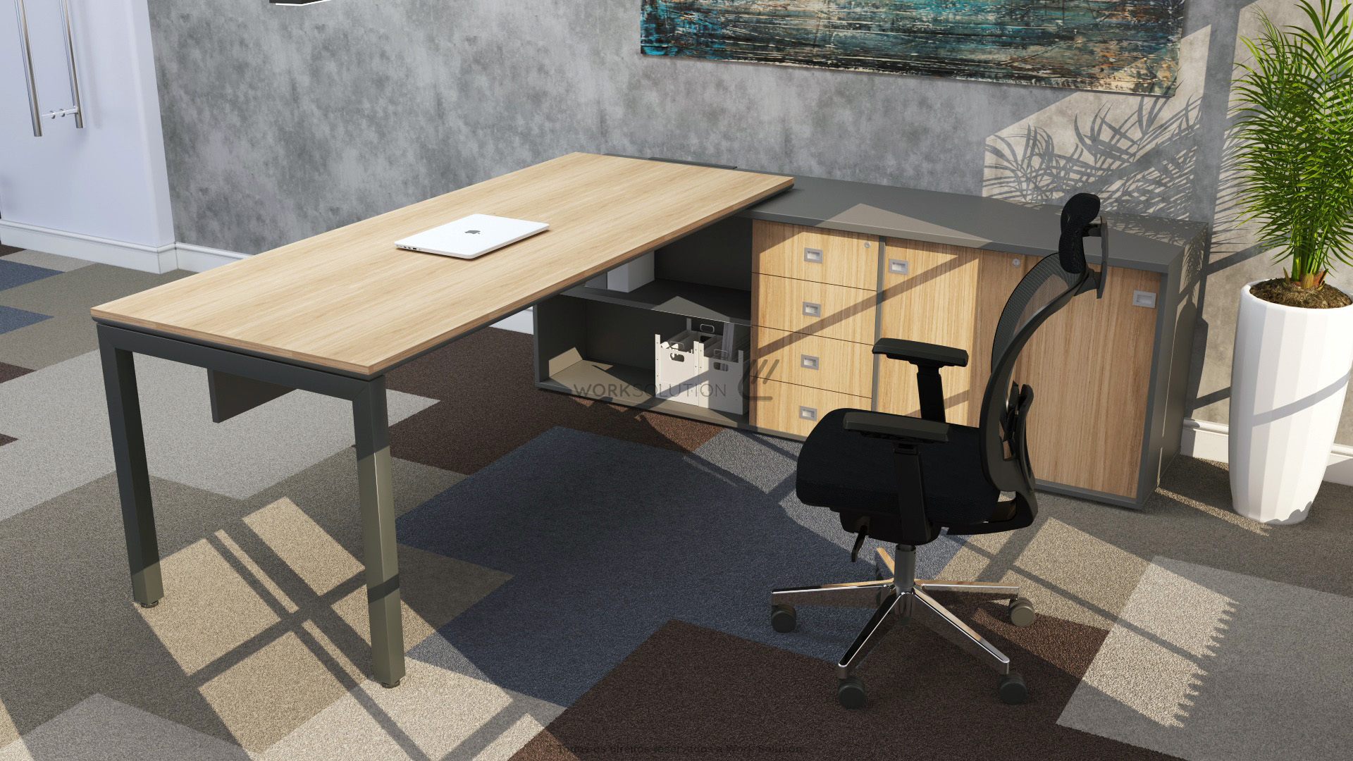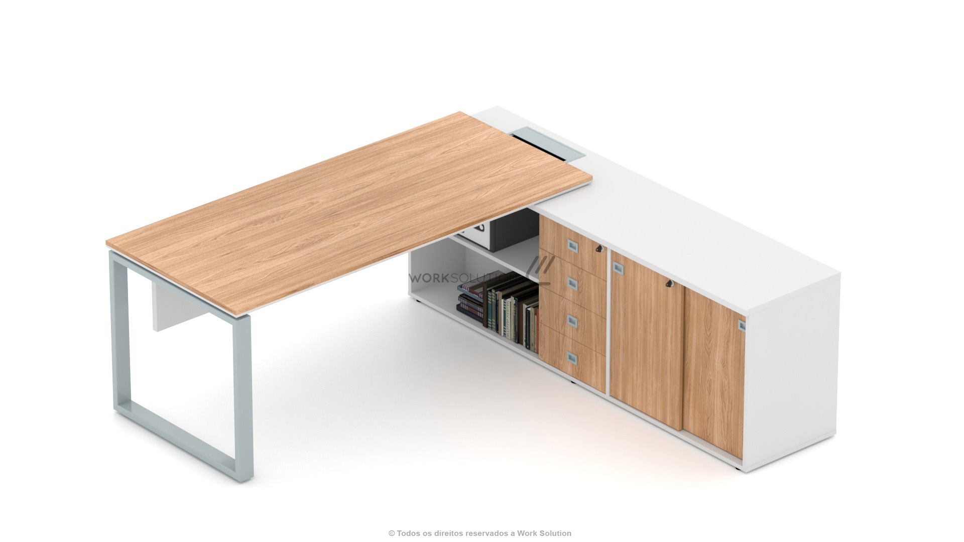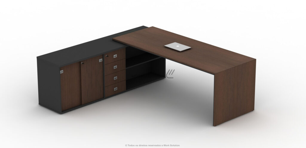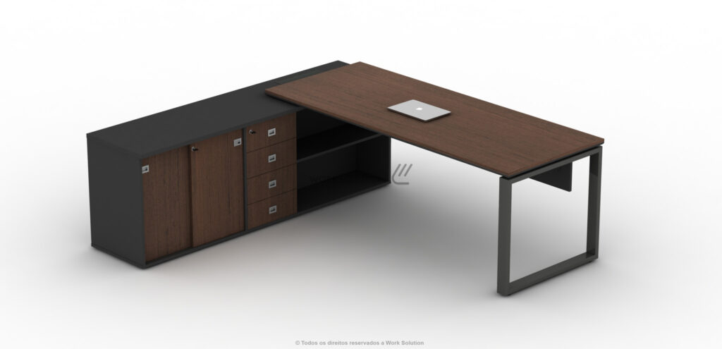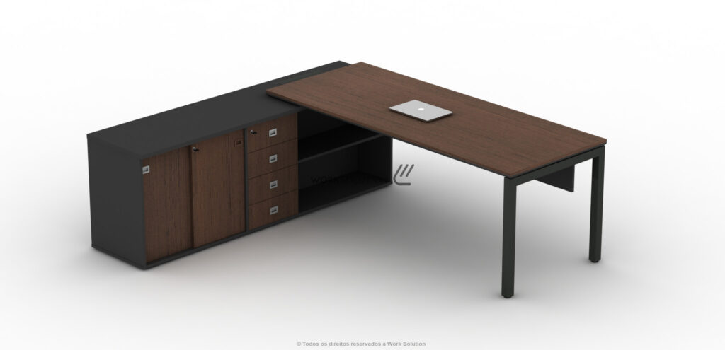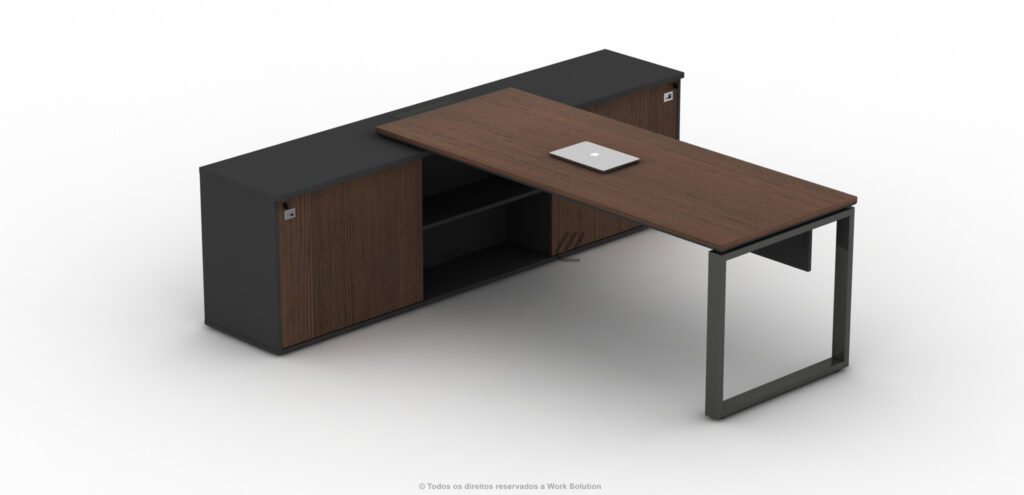 Quando se trata de otimização de espaço, a mesa executiva da linha WS 1000 é perfeita, pois concentra uma ampla superfície de trabalho e diversos módulos de arquivos. Simule o funcionamento clicando nos botões abaixo da imagem.