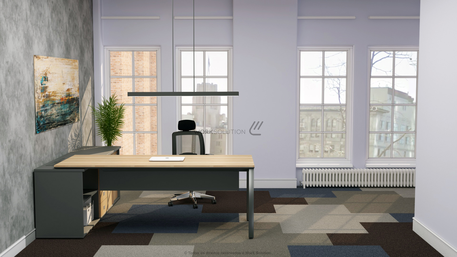O produto é intercambiável, seus pés podem ser de madeira (PAINEL) ou de aço nos modelos QUADRO e TRAVE. A linha WS 1000 é recomendada para ambientes executivos que buscam transmitir maior imponência e modernidade. Logo abaixo, explore detalhes da mesa executiva através dos recursos: 360º, simulação de cores, ilustração técnica e muitos outros.